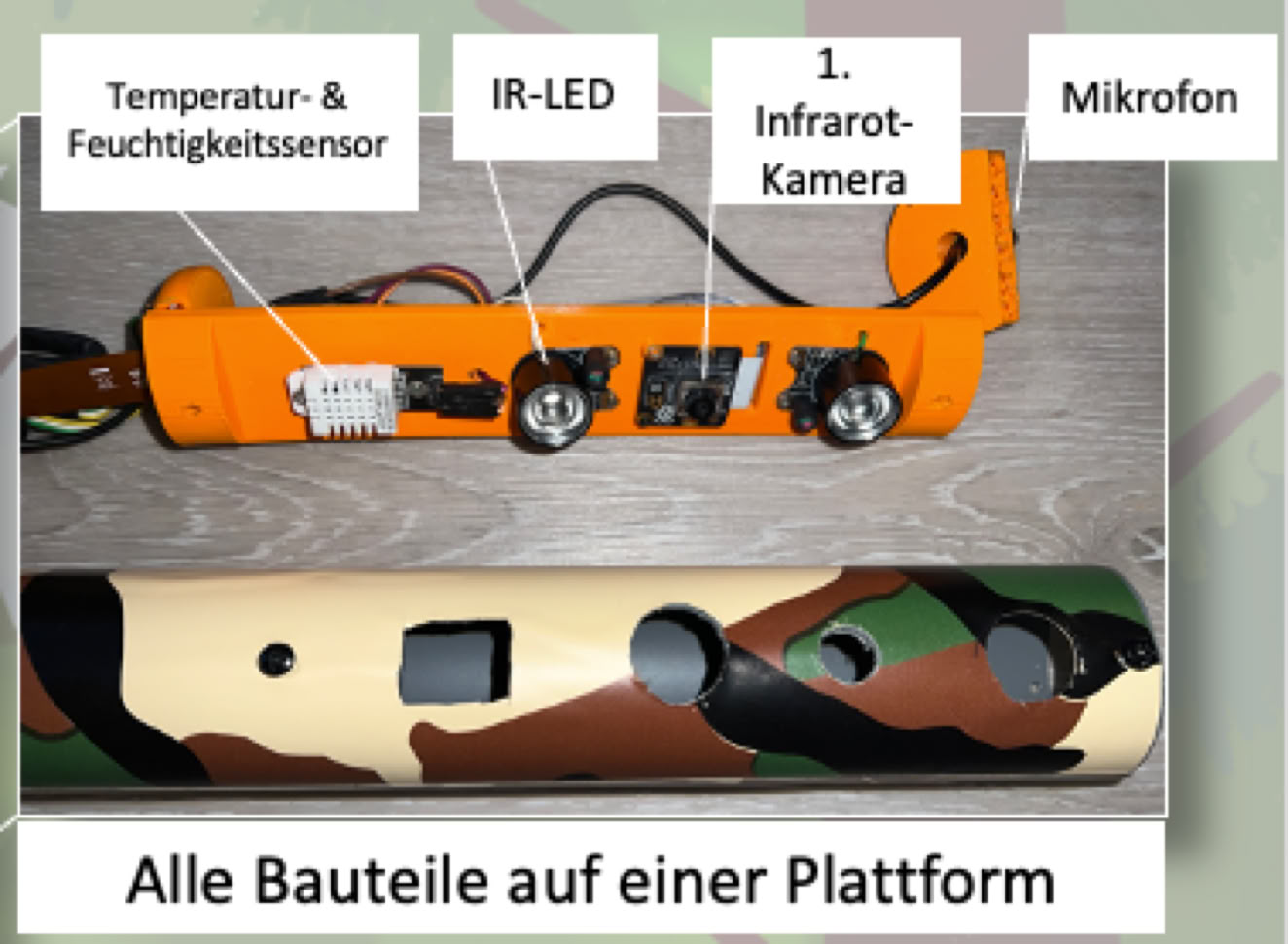 Abb. 2: Die Kamera, das Mikrofon und der Temperatur- Luftfeuchtesensor wurden auf einer 3D-gedruckten Plattform montiert, die man einfach in das Rohr von oben einschieben kann.