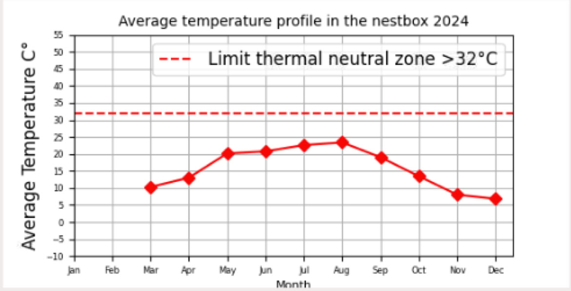 Da das von uns beobachtete Eulenpärchen ihr Brutgeschäft leider Ende April 2024 (vermutlich aufgrund von Mangel an Nahrung) gar nicht erst begonnen haben und sie auch danach für lange Zeit nicht mehr im Kasten aufgetaucht sind, konnte nicht beobachtet werden, welchen Einfluss solche hohen Tagestemperaturen auf die Eulen haben.