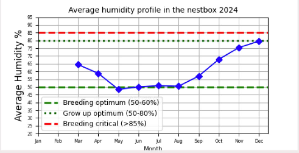 In dem Zeitraum in dem die Vögel in der Regel brüten (von März bis Mai) lagen die Werte für die Luftfeuchtigkeit im Mittel zwischen 50 bis 65 % (siehe Abb. 2). Von Wildvögeln, die in Brutkästen aufgezogen werden, weiß man, dass das für das Brüten optimal ist. Die dazugehörenden Einzelwerte (Datenbasis) findet man in der Abbildung 3.